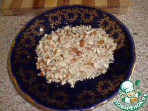 Миндаль порубим очень мелко. Можно блендером, просто мой блендер на "гастролях" у подруги и я порубила ножом.