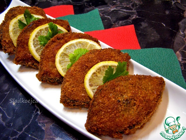 Разогреть сковороду, влить растительное масло. Обжарить куски рыбы с двух сторон до золотистой корочки, посыпая каждую сторону панировочными сухариками.