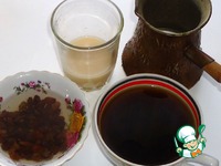 Сварить кофе, остудить, изюм залить кипятком на 15 минут, в небольшом количестве воды растворить дрожжи с 1 чайной ложкой сахара и дать подняться. |