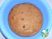 Затем в остывшее кофе добавить подошедшие дрожжи, остальной сахар, соль, какао - порошок, растительное масло, изюм и постепенно добавляя муку, замесить тесто. |