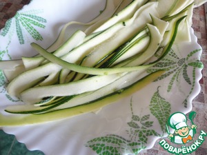 Для приготовления этого салата нужно нарезать маленький цуккини овощечисткой лентами.