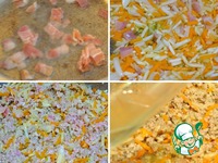 Мелко нарезанные овощи обжарить с ветчиной. Усилить огонь до максимума и выложить фарш.