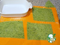 Дно формы смазать соусом бешамель. Выложить лист лазаньи.