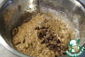 Теперь режем половину шоколадки на мелкие кусочки и добавляем в тесто.