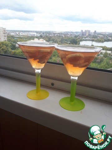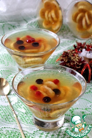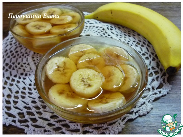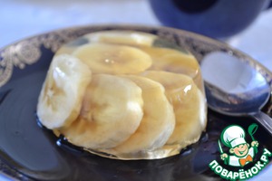 Дополнительное достоинство десерта - простота приготовления, я его сотворила буквально между делом, даже учитывая то, что заливала в два приема, так как бананы, оказывается, имеют способность всплывать в жидкости.