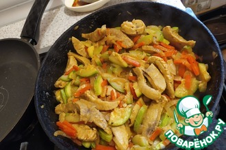 Нарезаем мясо соломкой. Выкладываем мясную соломку на предварительно разогретую сковороду, обжариваем на большом огне, пока не потемнеет, солим и перчим, далее наливаем водички, чтобы покрыло полностью мясо, накрываем крышкой и жарим на маленьком огне. Когда немного воды выкипело, выжимаем сок лайма и добавить граммов 30-50 соевого соуса, дальше продолжаем тушить. -