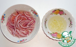 Лук очистить, нарезать полукольцами залить яблочным уксусом, чеснок пропустить через пресс, залить оливковым маслом и оставить на 30 минут.