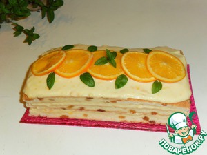 Разрезать бисквит на 3 коржа. Первый выложить на блюдо, пропитать сиропом, в котором варились апельсины, обильно смазать кремом. Закрыть вторым коржом, выложить крем. Третий корж выложить, пропитать кремом и поставить десерт в холодильник.
