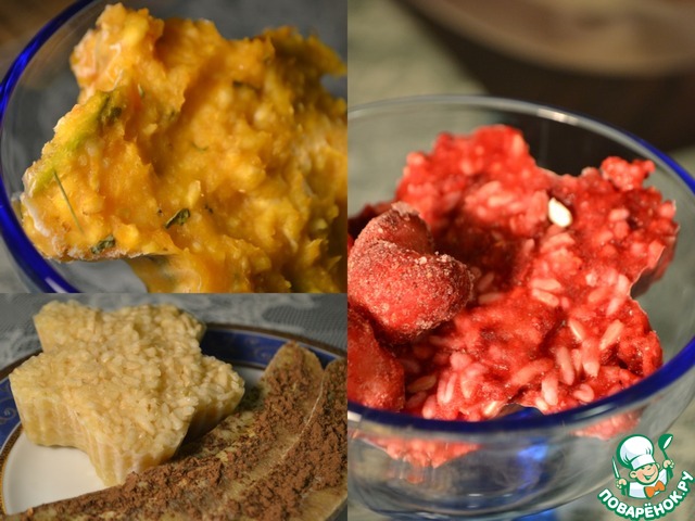 Остывший рис измельчить с сахаром в блендере до однородной массы. Рисовую массу разделить на три части, при этом две примерно одинаковые, одну поменьше.