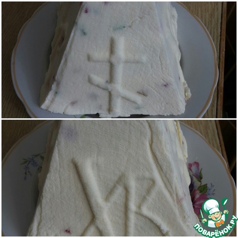 Делала в субботу, накануне Пасхи, поэтому навозившись с творогом , решила все упростить и массу уложила в форму , без предварительного пресса. Так она вверх дном простояла почти сутки, все схватилось, а стекшей сыворотки была капля.