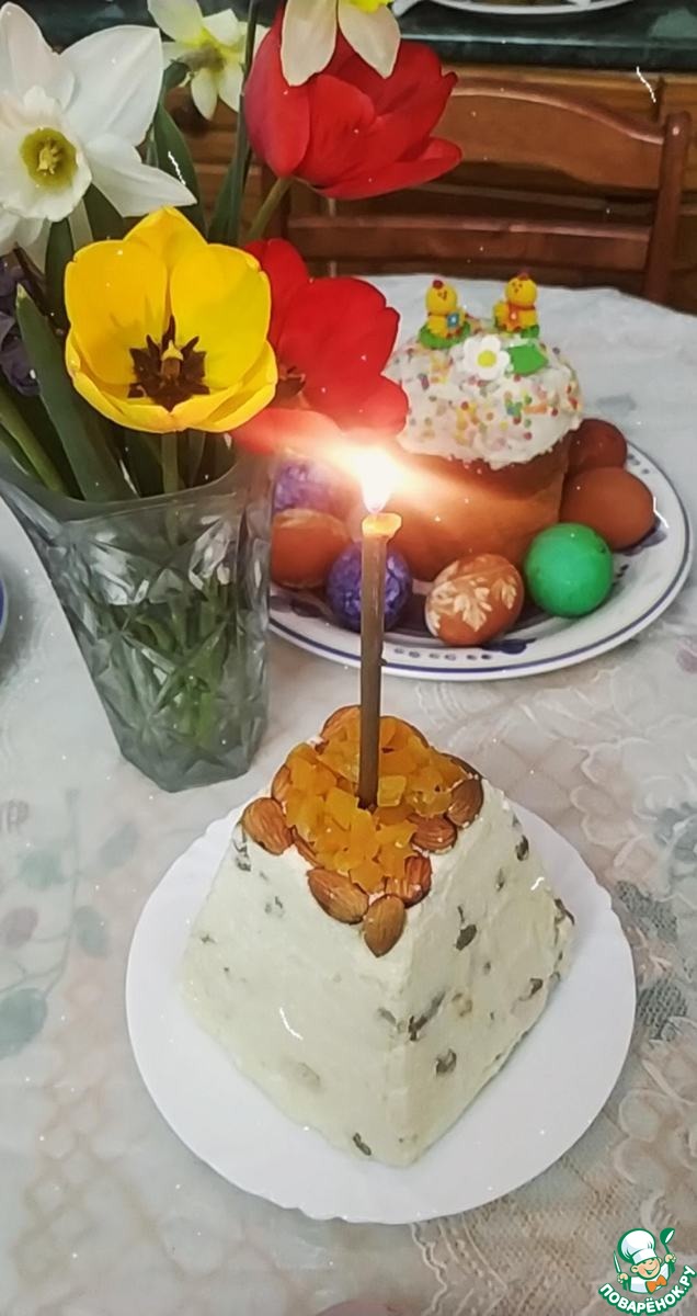 вот моя пасха, мне понравилось, что с вареными желтками и греть ни чего не пришлось. Я себя еле оторвала от неё, иначе бы всё слопала )))))