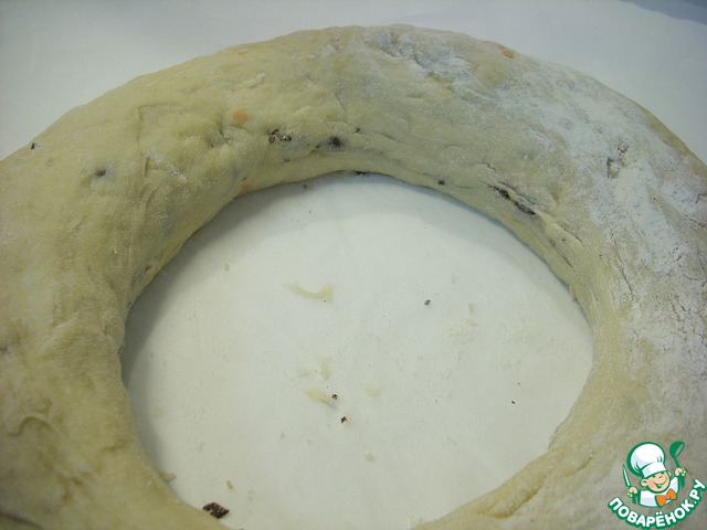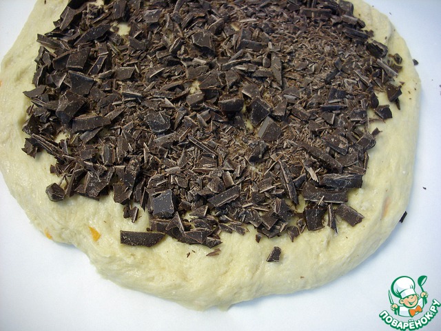 По истечению двух часов тесто здорово поднимется. В оригинальном рецепте эта бриошь без начинки, рубленный шоколад - моя выдумка, Вы можете использовать вашу любимую начинку, или вообще пропустить этот шаг. Отщипните маленький кусочек теста для украшения. Постелите на рабочем столе бумагу для выпечки длинной около 60 см. Присыпьте ее мукой, разомните руками остальное тесто в лепешку, сверху положите начинку.