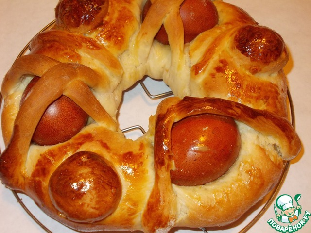 Теперь украшение. Помойте и просушите сырые яйца, вдавите их с двух сторон нашей 'короны'. Отложенный кусочек теста раскатать и вырезать четыре полоски, которые положить крест-накрест поверх каждого яйца. Аналогично делаются и другие полосочки и 'пуговки', если осталось еще тесто. Для румяности я смазала поверхность смесью из желтка и 1 ч. л. молока. Выпекать 30-35 минут в заранее разогретой до 180 гр. духовке.
