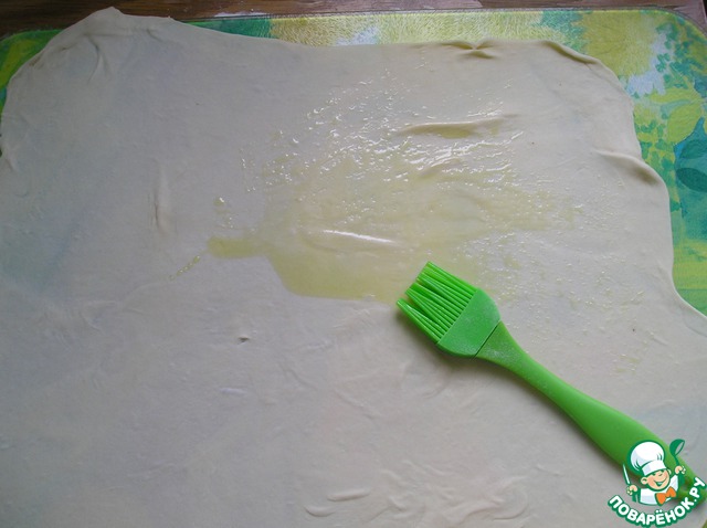 Делим тесто на 2 части. Одну из них раскатываем на присыпанной мукой поверхности как можно тоньше и кисточкой промазываем тонким слоем масла. Я использую здесь оливковое масло, моя бабушка пользовалась топленым. или топленым пополам с растительным. Выбор масла целиком зависит от ваших предпочтений.
