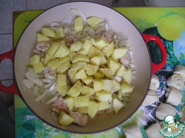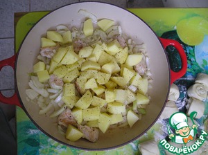 Филе индейки режем на кусочки примерно 1,5х1,5 см., картофель- на такие же кусочки, а лук нарезаем четвертькольцами. В разогретое масло кладем мясо и жарим на среднем огне до легкого зарумянивания. Добавляем лук и жарим еще 2-3 минуты.