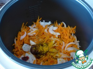На дно чаши мультиварки вылить масло, выложить натертую на крупной терке морковь, порезанный полукольцами лук, слегка посолить, добавить куркуму и перемешать.