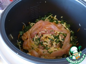Далее в чашу мультиварки выкладываем тертый на крупной терке сыр, нашинкованную зелень и филе из куриных грудок.