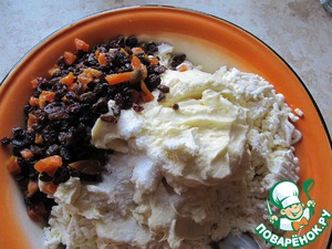 Вымытые сухофрукты просушить, крупные порезать, чтобы составляющие имели одинаковый размер. В посуду высыпать сахар, выложить протертый творог, добавить изюм, курагу, если любите - цукаты, мягкое сливочное масло хорошего производителя (не греть!), ванильный сахар, ванилин