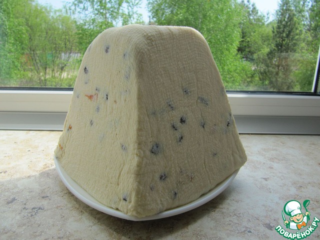 Подготовить форму - застелить в 2 слоя марли с запасом по краям, выложить творожную массу, поставить поддон, сверху положить гнет. Пусть 2 часа постоит при комнатной температуре, периодически нужно сливать из поддона сыворотку. Потом на ночь поместить в холодильник.