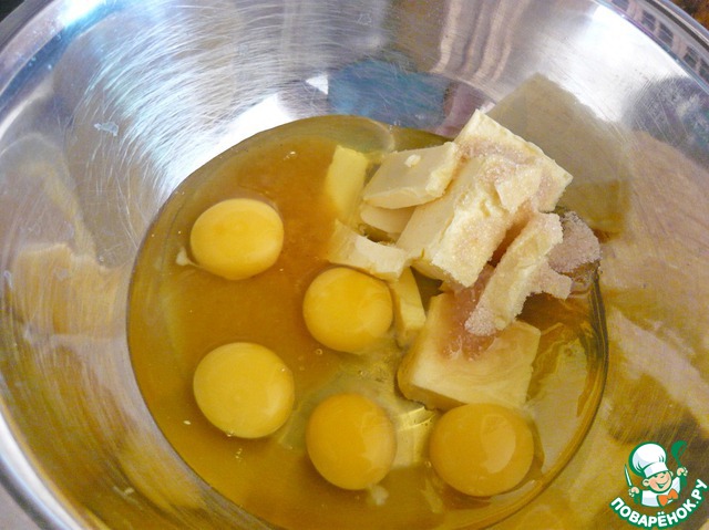 В это время ставим миску на водяную баню, добавляем туда мягкое сливочное масло, яйца, оставшийся коричневый сахар, щепотку соли и мед.