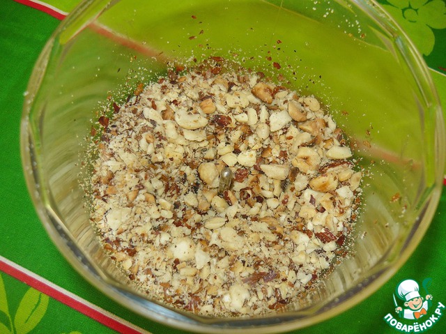 Орехи необходимо очистить, подсушить в духовке или на сухой сковороде и перемолоть блендером.