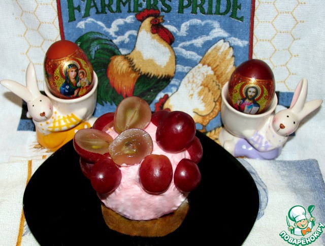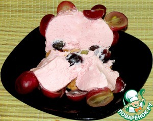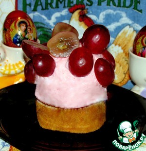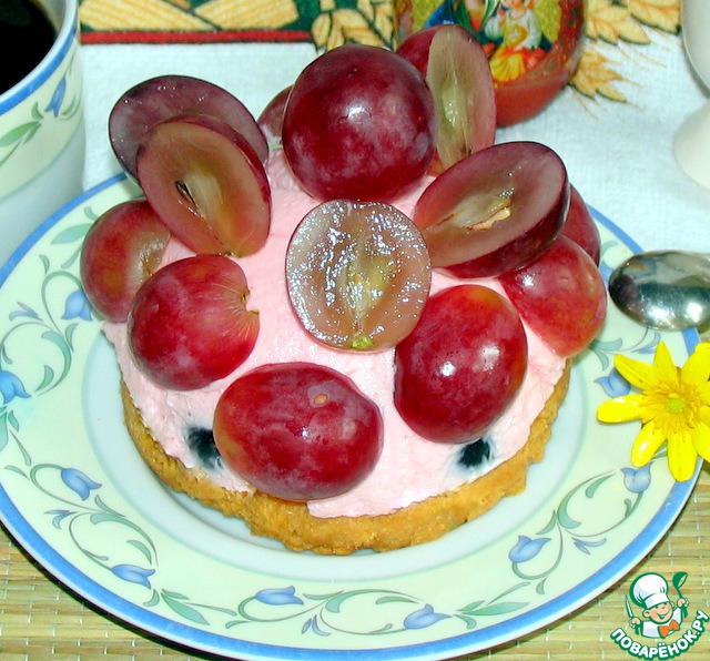 • Ингредиенты для основы - печенье, сливочное масло. Крем-сливки жирные, маскарпоне, клубничное желе, виноград мелкий. Для украшения - крупный виноград...