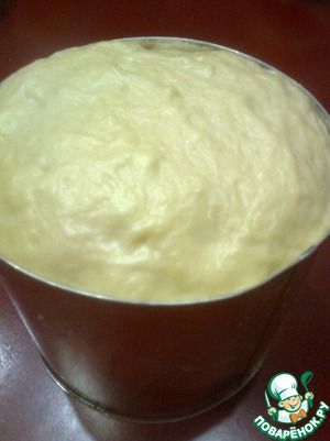 Отдельно взбиваем яйца с сахаром, солью и ванильным сахаром. Вливаем ету смесь в тесто и мешаем, добавляем сливочное масло и снова мешаем. Постепенно вводим муку (3 стак.) и вымешиваем некрутое тесто. Накрываем крышкой или полотенцем и даем подойти в теплом месте на 1 час. -
