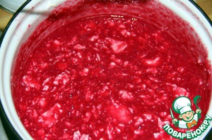 Оставшуюся часть клюквенного пюре (3-4ст. л.) соединяем с желатином (его нужно предварительно замочить холодной водой), нагреваем и остужем.