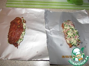 Мясо режем небольшими кусочками. Смешиваем приправу хмели-сунели и соль, (при добавлении соли учитывайте, что колбаса и сыр тоже соленые) получившейся смесью натираем мясо. Из фольги вырезаем квадраты и выкладываем на них мясо. На мяса выкладываем начинку (как на правом квадрате), сверху начинки кладем второй кусочек мяса (как на левом квадрате). Я делала два варианта.