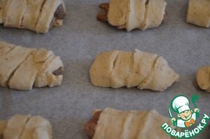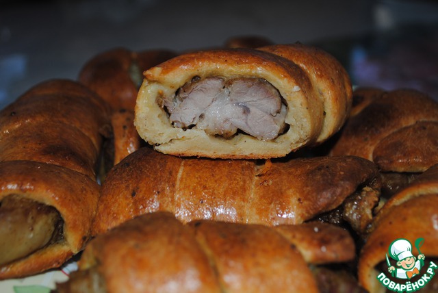 Тесто раскатываем в пласт толщиной 3-4мм, режем тонкими полосочками и обворачиваем кусочки мяса. Выкладываем изделия на противень застеленный пергаментом. Отправляем в разогретую духовку на 30-40мин. Минут через 15 от начала выпечки я смазала рулетики яйцом.