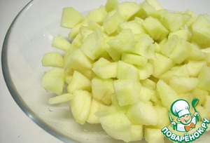 Кулич нарезать кубиками чуть больше, чем яблоки.