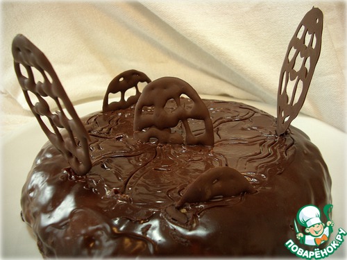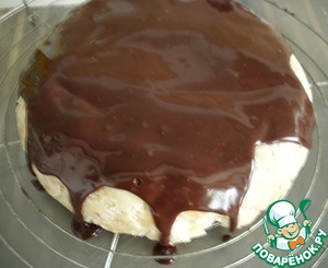 75 мл сливок довести до кипения, снять с огня, добавить 75 гр шоколада, подождать ровно 1 минуту, перемешать. Готово, можно покрывать наш торт. Простите за фотографию, глазурь настолько блестела, что никак не наводился фокус, а действовать надо было быстро. -