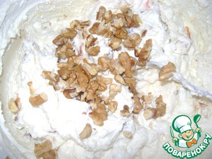 В сметанно-творожную массу добавить нарезанную курагу и грецкие орехи, предварительно поломанные рукой на небольшие кусочки.