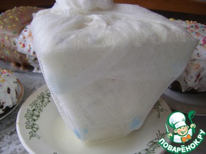 Через сутки снять груз, аккуратно отвернуть края марли, положить тарелку сверху на пасочницу и перевернуть, пасочницу аккуратно снять.
