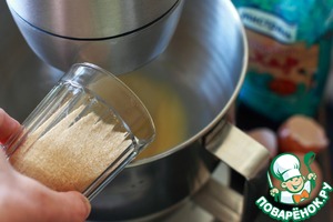 Всыпать сахар и взбить до побеления и увеличения массы. Количество сахара можно уменьшить грамм на 30, если вы любите малосладкие блюда.