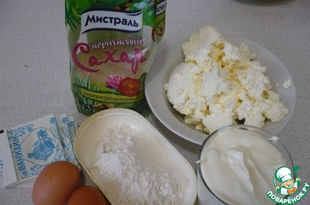 Приготовим ингредиенты для 1 теста :400 гр. творога,6 ст. л. сметаны, сахар 6 ст. л., яйцо 2 шт., мука 2 ст. л., ванилин 4 гр.