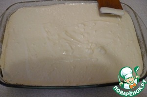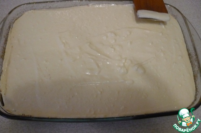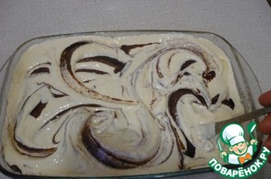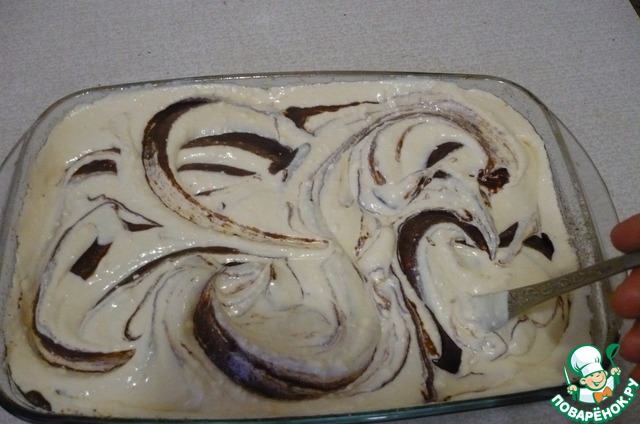 Сначала выливаем шоколадное тесто, а на него творожное.