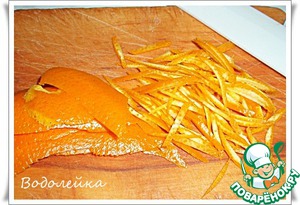 С одного апельсина снять цедру широкими лентами (остальное отложить для сока). Потом тонко нарезать ее соломкой.