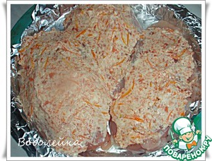 Филе выложить в форму для запекания (форму смазать маслом и можно застелить фольгой). Сверху на грудки выложить апельсиновое масло.