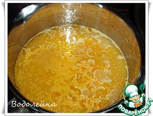 Теперь готовим соус. Для этого в кастрюле смешиваем бульон, апельсиновый сок. А также выливаем всю жидкость, которая образовалась после запекания наших филешек.