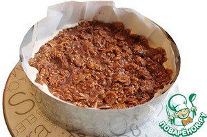 Далее нам нужно достать из морозилки наш кранч, снимаем его аккуратно с бумаги, переворачивая, кладем на мусс. У меня нет формы 24см, поэтому мне пришлось сначала положить бумагу, а потом все остальное. Я побоялась, что крем может вытечь.