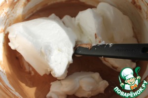 Далее нам надо взбить желтки (4шт) с сахаром (26гр) до увеличения в 3 раза. Затем смешаем желтки с растопленным шоколадом. И постепенно вмешаем белки. Перемешиваем все аккуратно лопаткой сверху вниз.