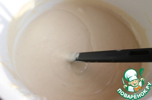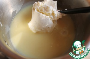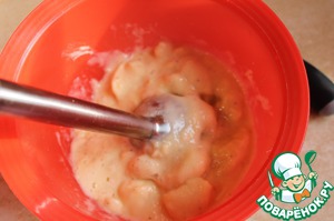 Добавим банановое пюре и взобъем слегка. Желатин нам надо залить водой (50мл) заранее на 10-15минут. Дать ему набухнуть и затем распустить. Вмешаем 2 ст. л. ложки взбитых сливок в желатин, и выльем эту массу в банановую смесь. Затем, постоянно мешая ее, добавляем сливки.