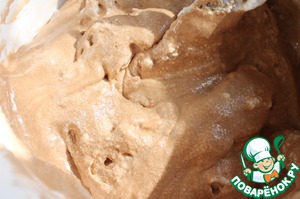 Теперь нам надо смешать сухие продукты. Это мука и молотый миндаль. Вмешиваем муку с миндалем постепенно, в 3 приема, в нашу жидкую массу.