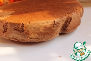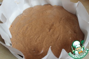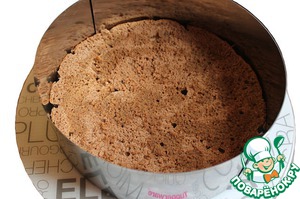 Такой у меня бисквит получился. Очень нежный. Даем ему остыть, убираем кольцо и преворачиваем, так быстрее остывает.