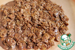 Делаем теперь кранч. Готовые хлопья для завтрака смешаем с рубленым фундуком. В сотейнике доведем до кипения сливки, добавим сливочное масло, все размешаем. Поломаем шоколад, добавим все в эту смесь и дадим шоколаду раствориться. Oстудим массу до комнатной температуры, размешаем ее с орехами и хлопьями.