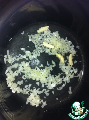 Разогреть сковороду, добавить 2 ст. л. оливкового масла и обжарить до полуготовности лук и чеснок. Добавить томатную пасту и обжаривать 5 минут.
