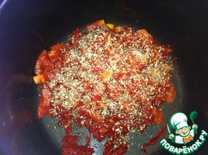 В готовую смесь добавить мякоть помидоров, перемешать, посолить, добавить темьян (чабрец). Закрыть сковороду крышкой и тушить минут 20-25 на мелком огне.