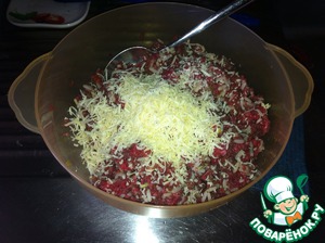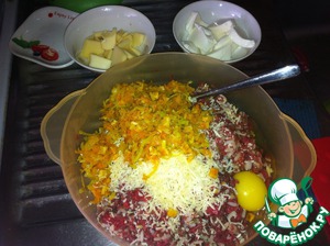 Овощи обжаренные остужаем и добавляем в миску с фаршем, сыром и рисом. Также добавляем одно куриное яйцо и тщательно вымешиваем.
