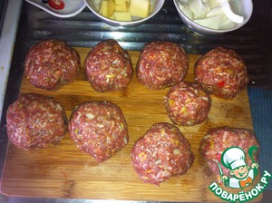 Из полученного фарша формируем куличики, также режем на кусочки сыр голландский и моцареллу. На сковороде, на которой жарились овощи, обжариваем со всех сторон наши куличики.